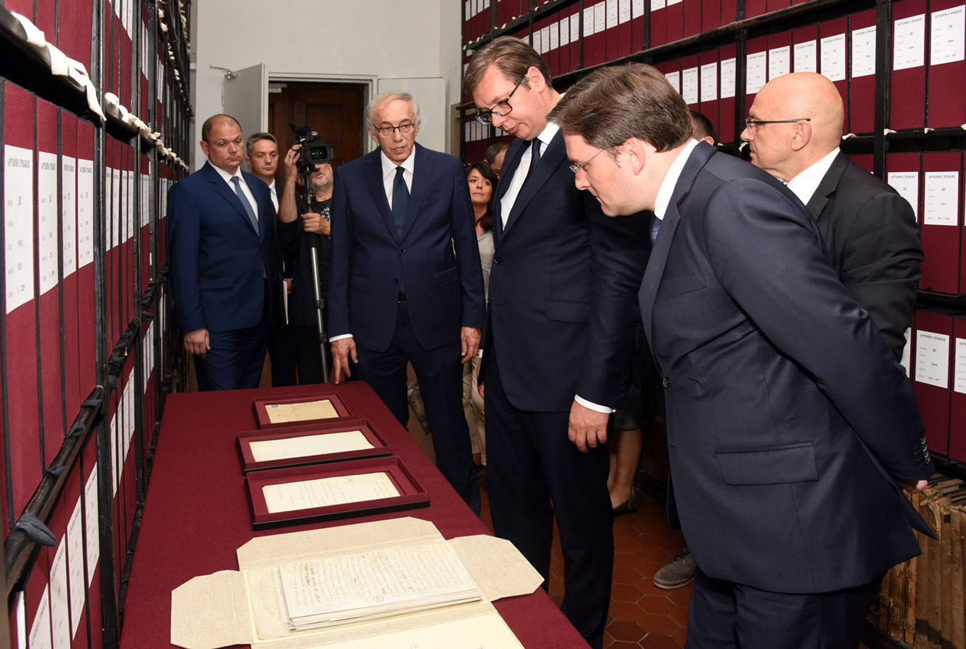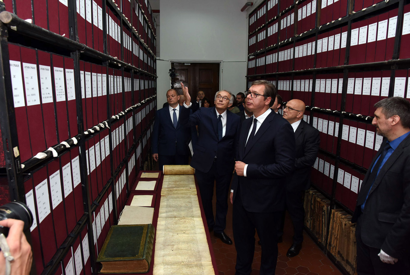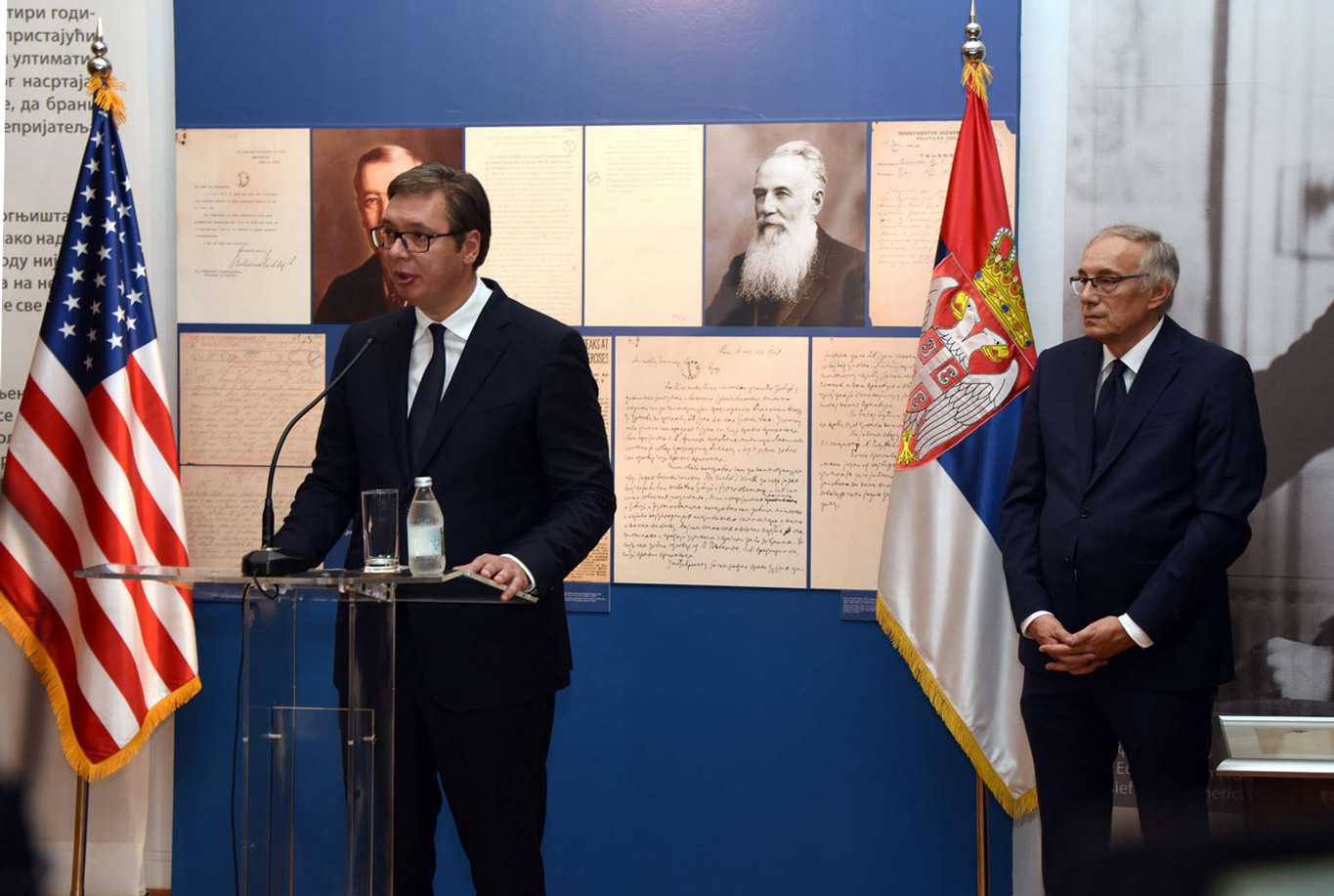 „Хоћемо данас пријатељство и партнерство у миру, да заједно стварамо Тесле и Пупине. Да нас то велико море, сва царства између нас, не раздвајају, већ да буду спона која нас приближава. Да кривце оставимо историји, јер они за будућност нису потребни. Поздрављам сваки нови дан у односима Србије и Америке“, поручио је председник Александар Вучић и истакао важност Архива Србије као установе, као и докумената који се у њему налазе, а који треба да буду што видљивији и приступачнији, како би из прошлости могле да се извуку поуке за будућност.