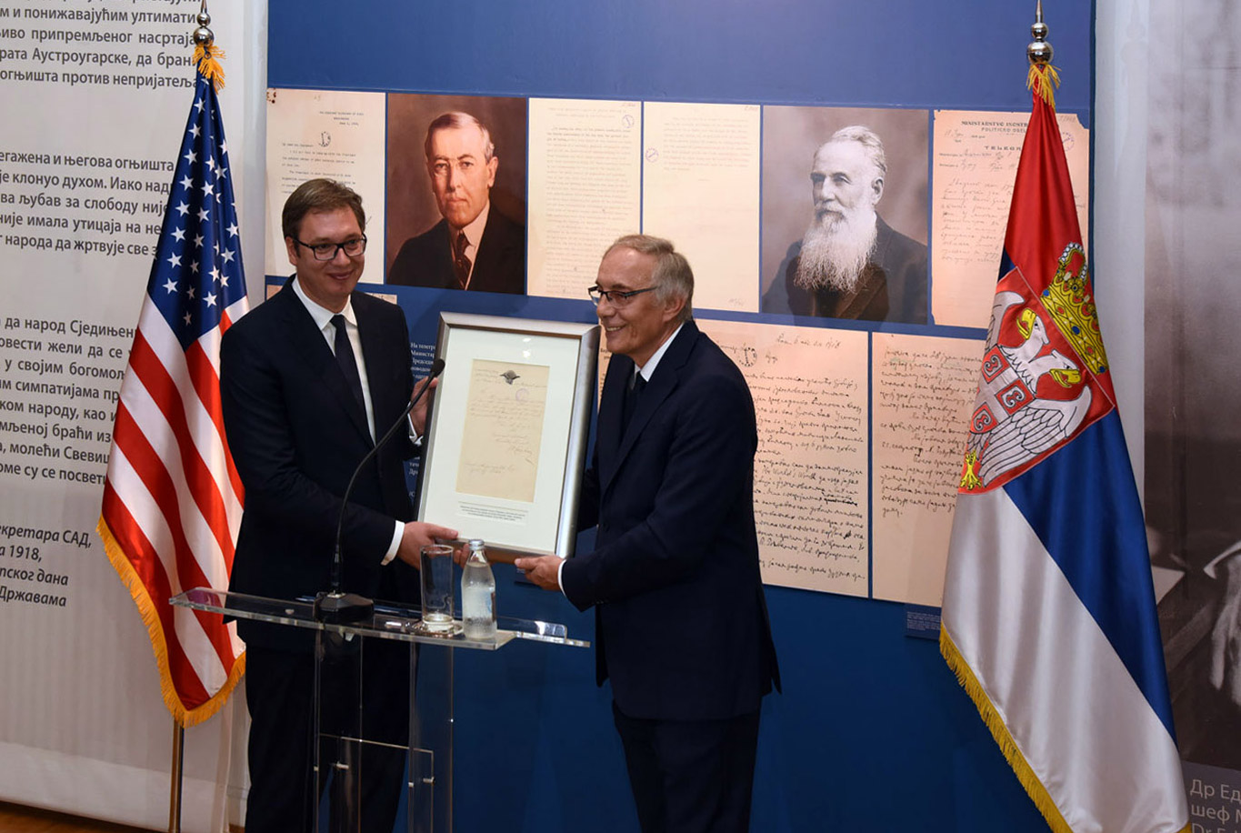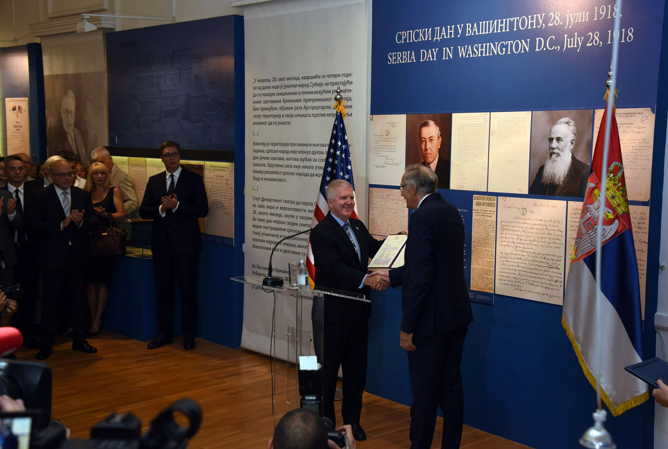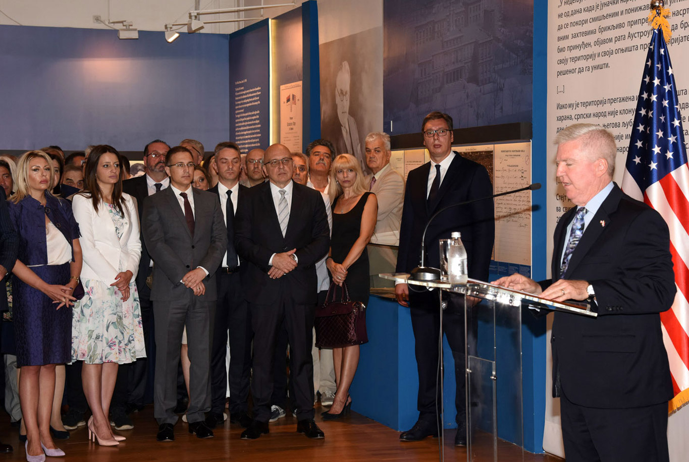 Изложбу jе отворио председник Републике Србије Александар Вучић, приметивши да је 28. јул важан дан у историји Србије и оценивши да су наши односи са Сједињеним Америчким Државама вишеслојни и вишезначни, те да као мали народ треба да тежимо што бољим односима са овом највећом светском силом. Захваљујући труду Архива Србије имамо прилику, рекао је председник Републике Србије Александар Вучић, да видимо значајна документа, цитате, телеграме, који су бележили нашу историју и указују са колико поштовања смо се обраћали једни другима и како је један мали народ успевао да буде партнер тако великој и важној сили као што су САД.