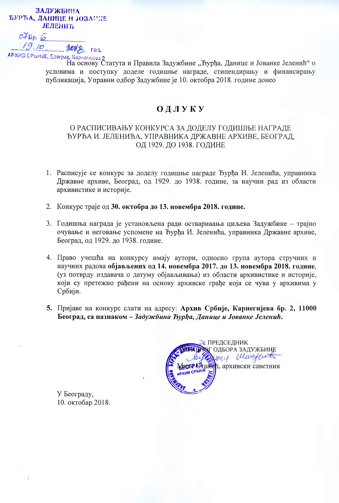 1. Расписује се конкурс за доделу годишње награде Ђурђа И. Јеленића, управника Државне архиве, Београд, од 1929. до 1938. године, за научни рад из области архивистике и историје.